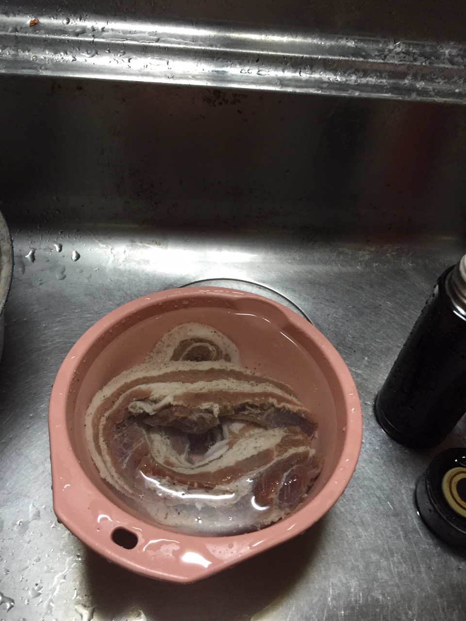 そのまま燻製をすると、完成後、ものすごく塩辛いベーコンになってしまいますので、しっかりと塩気を抜きます。