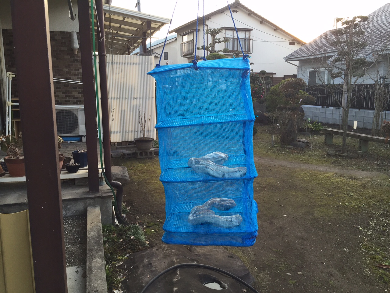 虫よけのネットの中に置き、風通しの良いところで二日ほど干します。