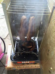 燻製機を組み立て、カセットコンロに置き、肉をぶら下げ、一番下に、ウッドチップを入れた金皿を設置。